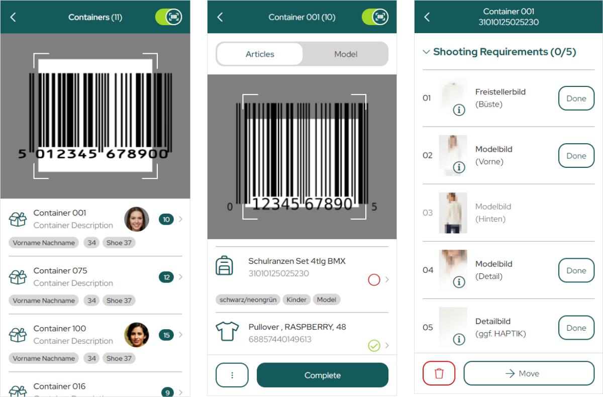 Process step 3 Photo shoot: List of goods containers (left), container detail page with item list (center), item detail page with list of required photos of the item (right) (screenshots of Axure™ prototype).