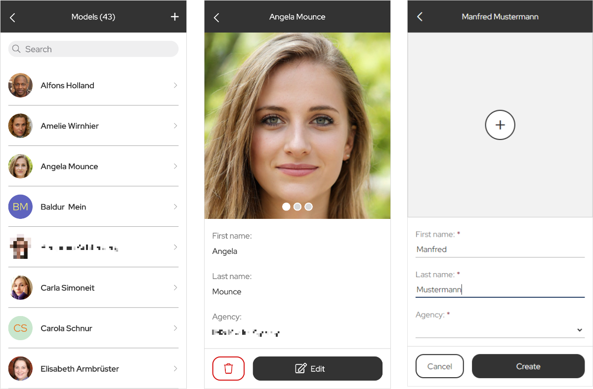 Photo model management (left), detail page of a photo model (center), create new photo model (right) (screenshots of Axure™ prototype).