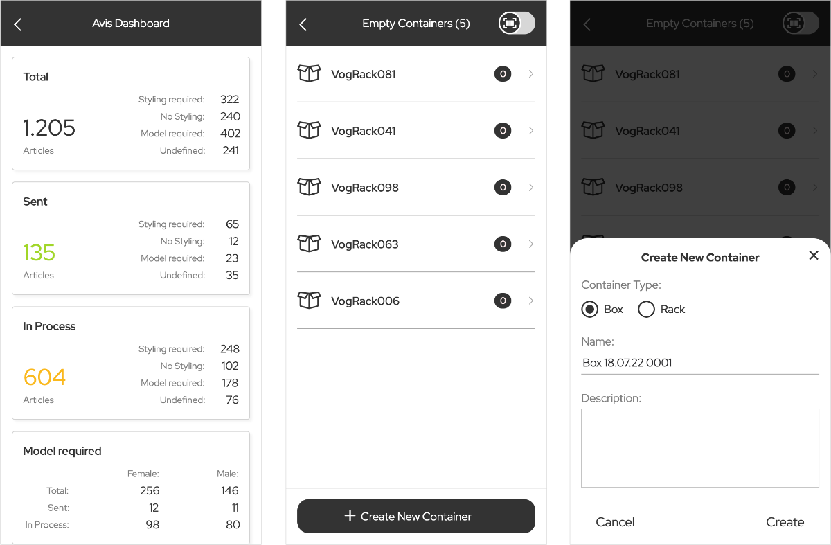 Dashboard with status of goods deliveries (left), list of empty goods containers (center), creation of a new goods container (right) (screenshots of Axure™ prototype).